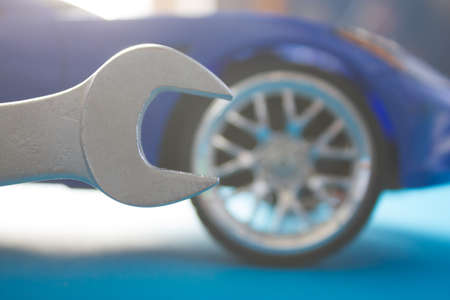 Concept of car repairing and maintenance. The toy car repair with wrench.
