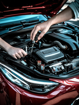 Hands of a skilled auto mechanic adjust components in a car engine ensuring everything runs smoothly while engaged in routine maintenance tasks.