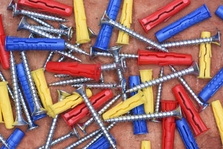 Plastic Dowels ans Screws on Red Brick Background Top View