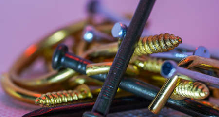 Construction fasteners. Self-tapping screws are scattered in a disorderly heap on a dark background. Excellent design for advertising construction fasteners
