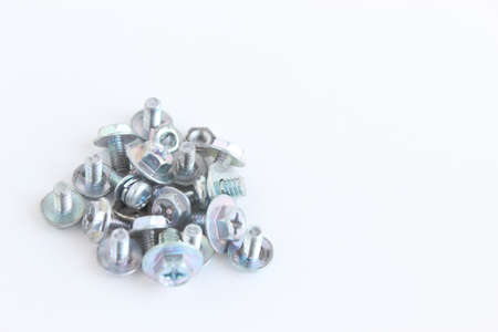Metal tapping screws for wood on white wooden background. Construction equipment concept. Copy, empty space for text.