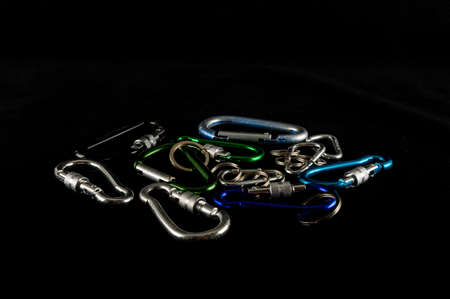 Metal aluminum snap hook isolated background Safety lock carabiner for rope climbing