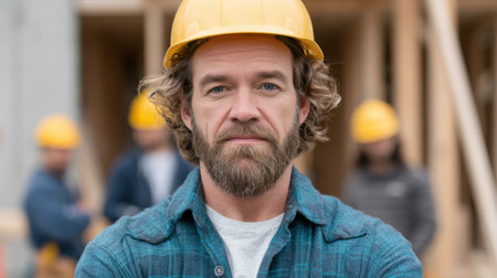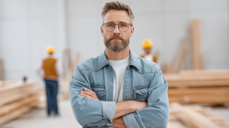 A confident adult male stands in a wooden workspace, showcasing his expertise in craftsmanship. Colleagues work in the background, enhancing the collaborative atmosphere.