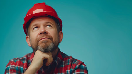 Worker is pensive about his work. concept of doubt and uncertainty. cyan background