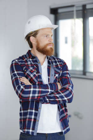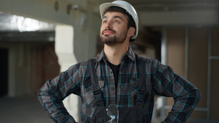 Picky inspector. professional repairman. turnkey project. man builder in work clothes.