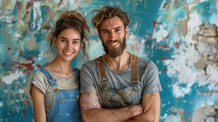 young stylish Caucasian man dressed in overalls and orange safety helmet. The woman is standing nearby.