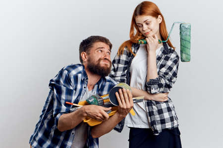 Man with a beard on a white isolated background with a beautiful woman holding construction tools for repair.