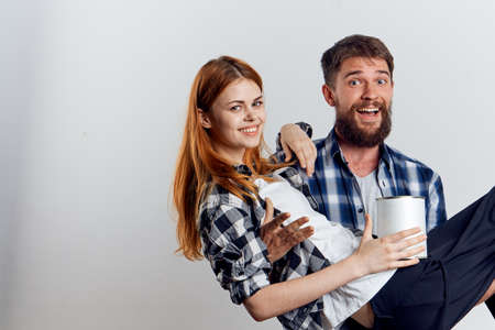 Man with a beard on a light background holds a young beautiful woman in hands, repair.