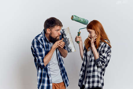 Young guy with beard and beautiful woman on white isolated background, repair, housework.