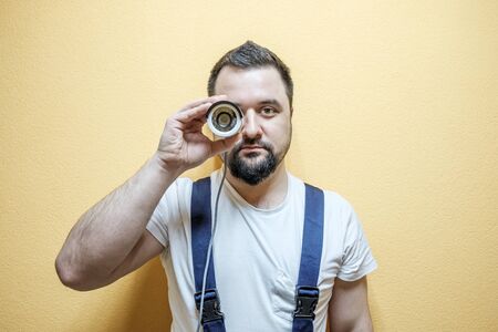 Worker man in uniform worker service yellow background emotion