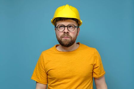 Puzzled bearded man in a construction helmet and round glasses looks up thoughtfully, on a blue background.