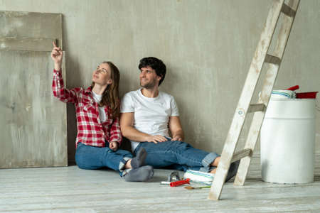 Happy family couple relaxing after painting. Young couple lying on the floor of new house and communicate with each other
