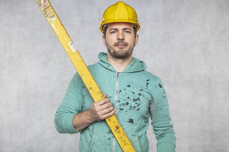 Young bearded man construction worker against gray background
