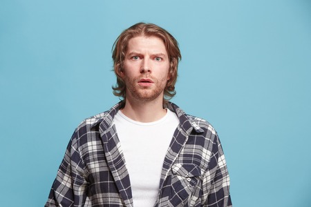 Beautiful man looking suprised and bewildered isolated on blue