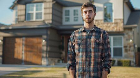 Portrait of a handsome young man standing in front of his new house
