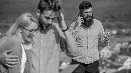 Couple colleagues flirting while boss busy with mobile conversation. Couple having fun while internet surfing outdoor. Colleagues use video conferencing instead mobile call. Mobile internet benefits