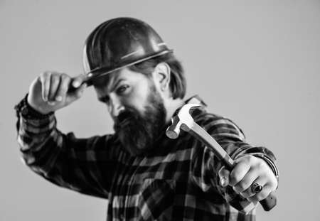 bearded male hipster in checkered shirt and laborer helmet, selective focus, hammer