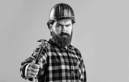 handsome bearded guy with beard and moustache hold hammer, selective focus, builder