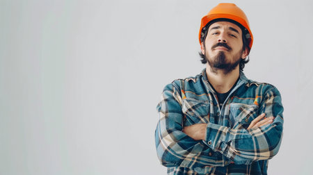 A confident construction worker stands with arms crossed in an industrial setting, showcasing safety gear and a serious professional demeanor.