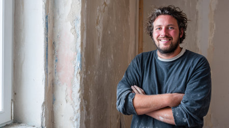 A cheerful male worker stands confidently in a renovation space, showcasing a smile and a casual look amidst unfinished walls and natural light, representing skilled craftsmanship.
