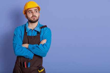 Shot of pensive dissatisfied construction worker dresses protective yellow helmet and brown apron, stands with arms folded, thinks over new building project.