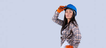 Banner, long format. Portrait of successful woman constructor wearing helmet and safety gloves. Architect standing at building site, looking at camera, copy space. Mature successful woman engineer.