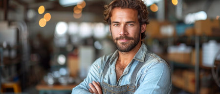 A skilled contractor with a stylish beard and wearing blue overalls is focused on crafting wood projects in a well-organized and spacious workshop, surrounded by various tools and equipment.