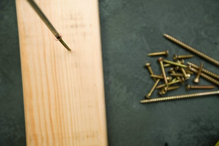 Golden screws screwed into wooden plank and screwdriver, close up