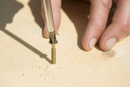 The carpenter screws the gold screw with a screwdriver.