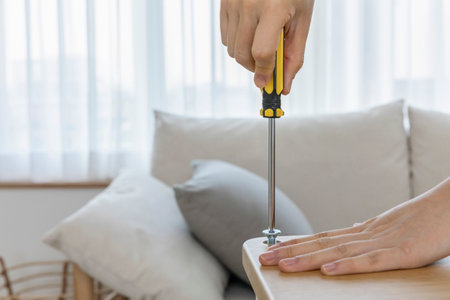 close-up of female hands screwing a metal furniture screw with a screwdriver. The woman collects furniture in the apartment on her own. Furniture assembly, Housework, DIY.