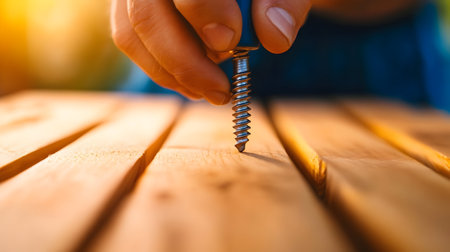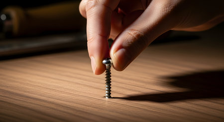 A close-up of fingers precisely holding a metal screw upright on a wooden surface. The image represents DIY projects, carpentry, assembly, or the beginning of a construction task.