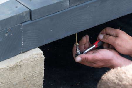 A man manually tightens a screw into the gazebo support to secure the floor to the frame, the work is related to installation.