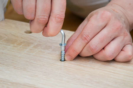 Furniture assembly. A worker fastens the parts of a bed using a confirmat. Close-up.