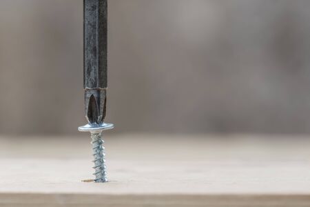 A steel screw is put on a screwdriver on a wooden board background. The concept of tools and repair work. Steel screws. Metal screw