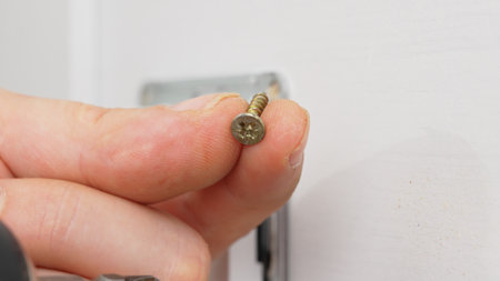Close-up hand holds a self-tapping screw and a screwdriver