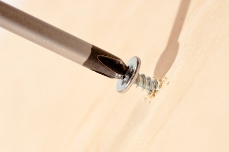 Screwing screw into wooden plank, closeup