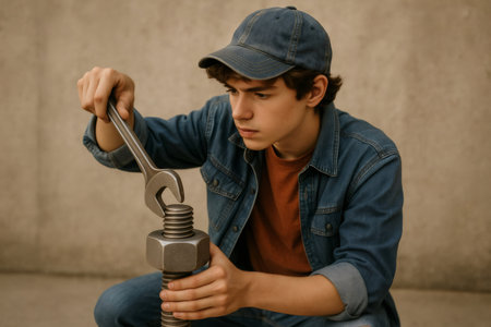 Concentrating on tightening a large bolt with a wrench, a young worker engages in essential maintenance tasks within the industrial sector