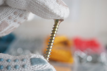 Hand holding a silver screw amidst various tools and materials