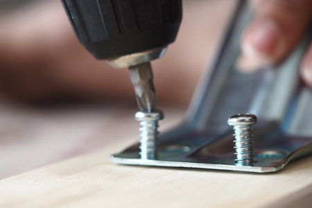 Close-up of a person using a drill on metal brackets