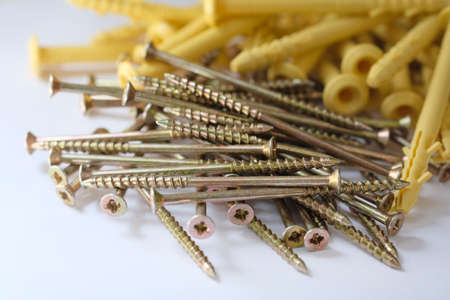 Yellow plastic dowels with metal screws on a white background. Construction material. An anchor is a fastener to hold any structure.