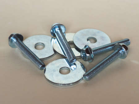 Silvery four bolts and pile screws on grey. Left upright bolt right light.