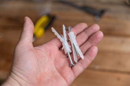 The screws and dowels lie in a man's palm. Silver fasteners lie in a man's hand. first person view. selective focus.