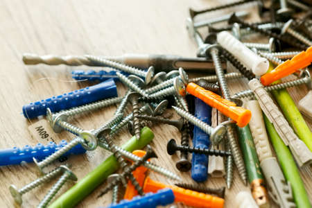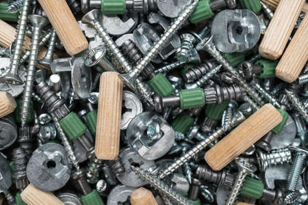 Closeup heap of screw, pad screw washer and plastic straddling dowel
