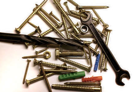 Many steel and brass screws, nuts, metal and plastic dowels scattered on flat surface