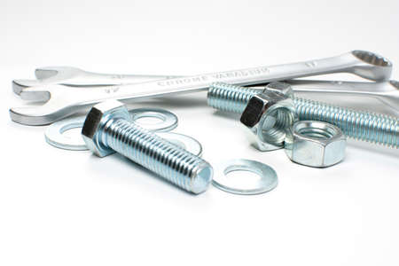 view of large galvanized anchor bolts and nuts and fasteners on white background