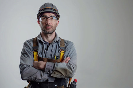 Laborer man in safety glasses, holding tools, standing professionally against a neutral white background