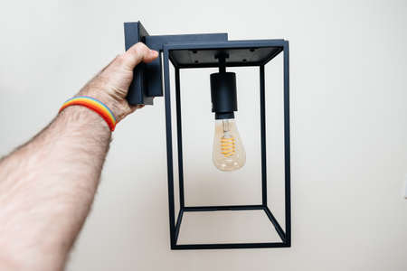 POV Male hand looking at vintage filament light bulb on box lantern wall light vintage style with edison filament bulb after unboxing before installation isolated on white background