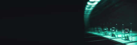 Pharmaceutical drugs banner. ampoules and a bottle of pills on a black background. opiate production concept. repetition in the mirror - conveyor.
