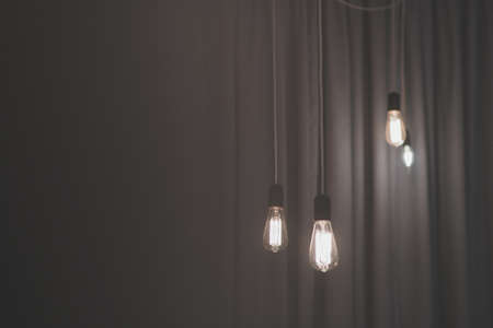 Vintage light bulb decor glowing in dark room. Lighting decor.