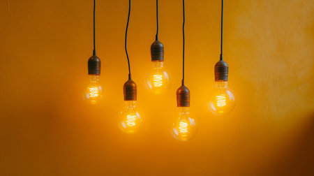 Vintage incandescent Edison light bulbs hanging on yellow wall.